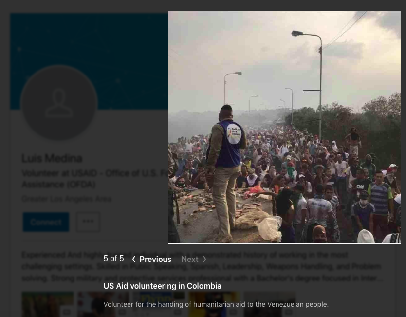 On LinkedIn, Medina posted a photo of himself on the bridge in Cúcuta wearing a vest from the group “Coalition Aid and Freedom Venezuela.” This was a US-allied Venezuelan front group of pro-opposition volunteers who served as shock troops for the coup attempt.