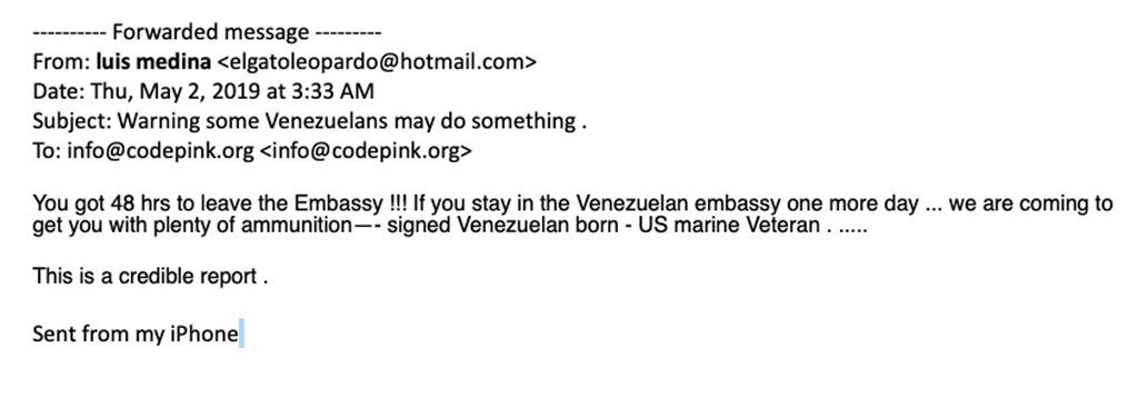 A far-right Venezuelan opposition activist emailed a death threat to human rights activists from the peace group CODEPINK. The threat was delivered when CODEPINK was helping to protect the Venezuelan government’s embassy in Washington, DC from an illegal takeover by Juan Guaidó’s US-backed coup administration.
