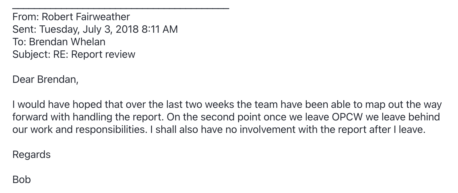 In response, Fairweather pointed out that “once we leave OPCW we leave behind our work and responsibilities. I shall have no involvement with the report after I leave.”