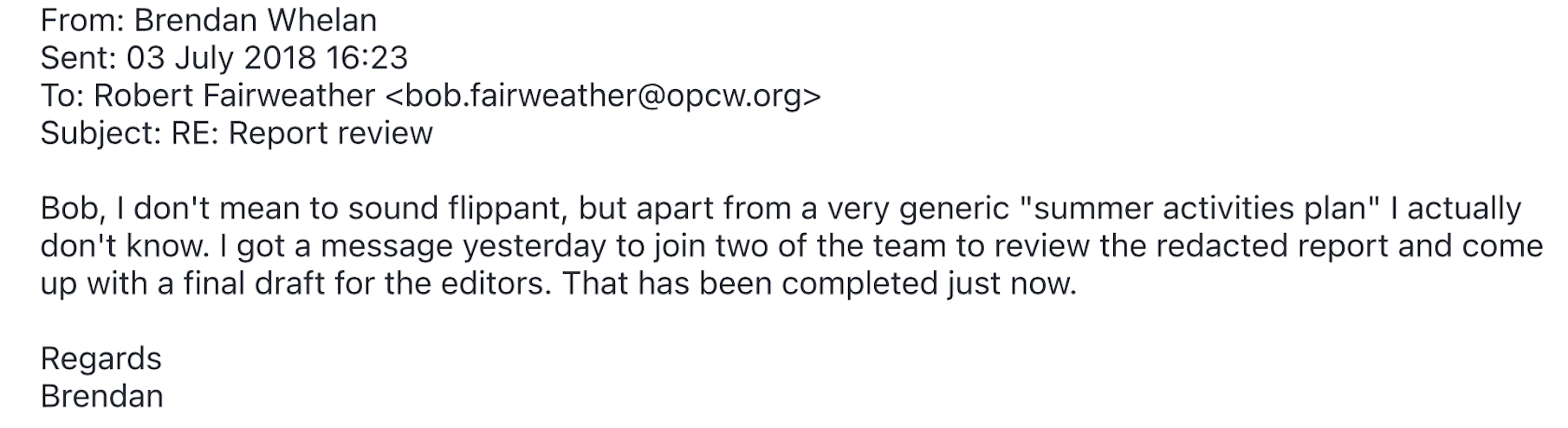 Whelan was clearly invoking the dispute over the doctored original report, and the deceitful attempt to rush it out for publication unbeknownst to the Douma FMM members. Fairweather did not provide a direct response. Instead, he evaded Whelan’s request by replying: “I would have hoped that over the last two weeks the team have been able to map out the way forward with handling the report.”