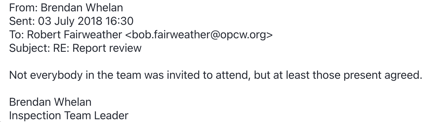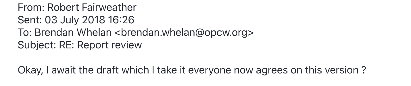 The “document” to which Arias refers is in fact not even a document, but an email. The exchange began on July 2nd, when Whelan wrote to Chief of Cabinet Bob Fairweather – the deputy to then-OPCW Director General Ahmet Üzümcü (Arias would take over a month later) – with a request about the pending Interim Report.