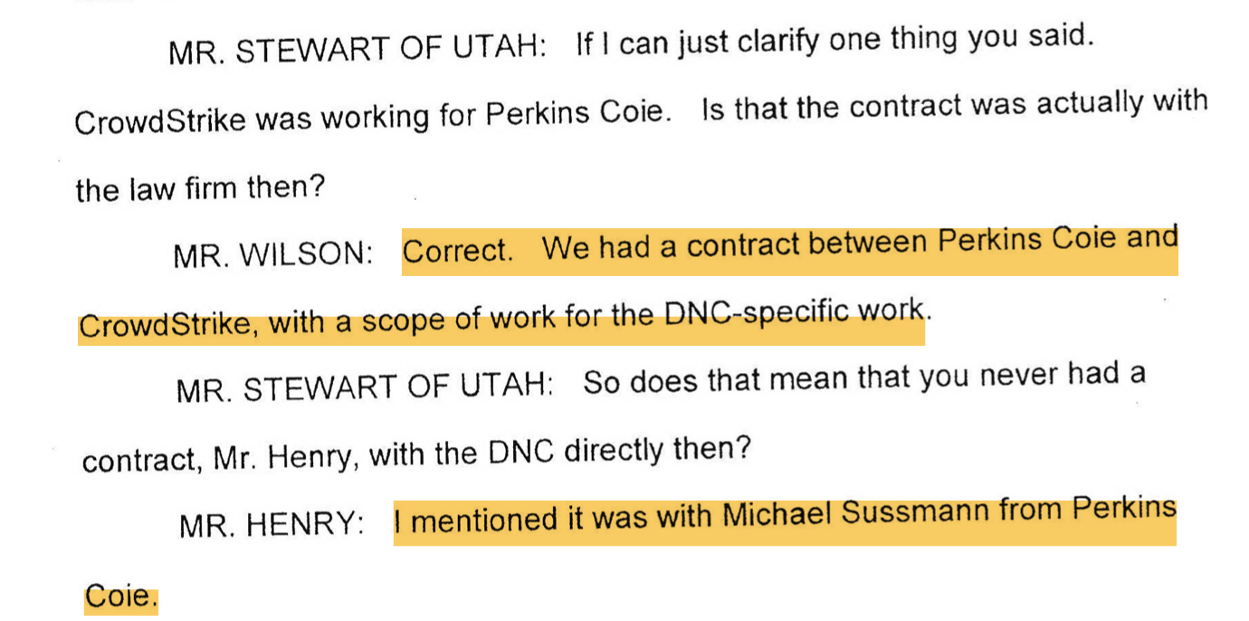 This allegation was generated by a different private firm, Crowdstrike, which, like Fusion GPS, was also hired by Perkins Coie — specifically, by Michael Sussmann.