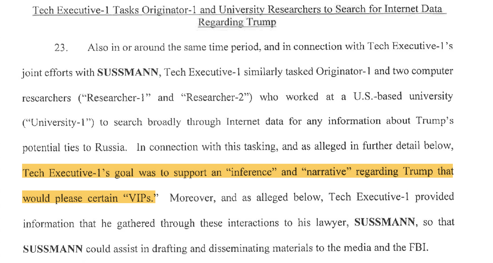 Sussmann is charged for failing to disclose that he was acting on behalf of Clinton’s team. But the indictment makes clear that Durham has uncovered a wider deception. For weeks prior to his meeting with the FBI, Sussmann worked with the unnamed technology executive (“Tech Executive-1”), who, like the Clinton campaign, was also Sussmann’s client. The executive’s “goal”, Durham says, was to create a “narrative” about Trump’s “ties to Russia” which would ultimately “please certain ‘VIPs'” – i.e., Sussmann’s clients in the Clinton campaign.