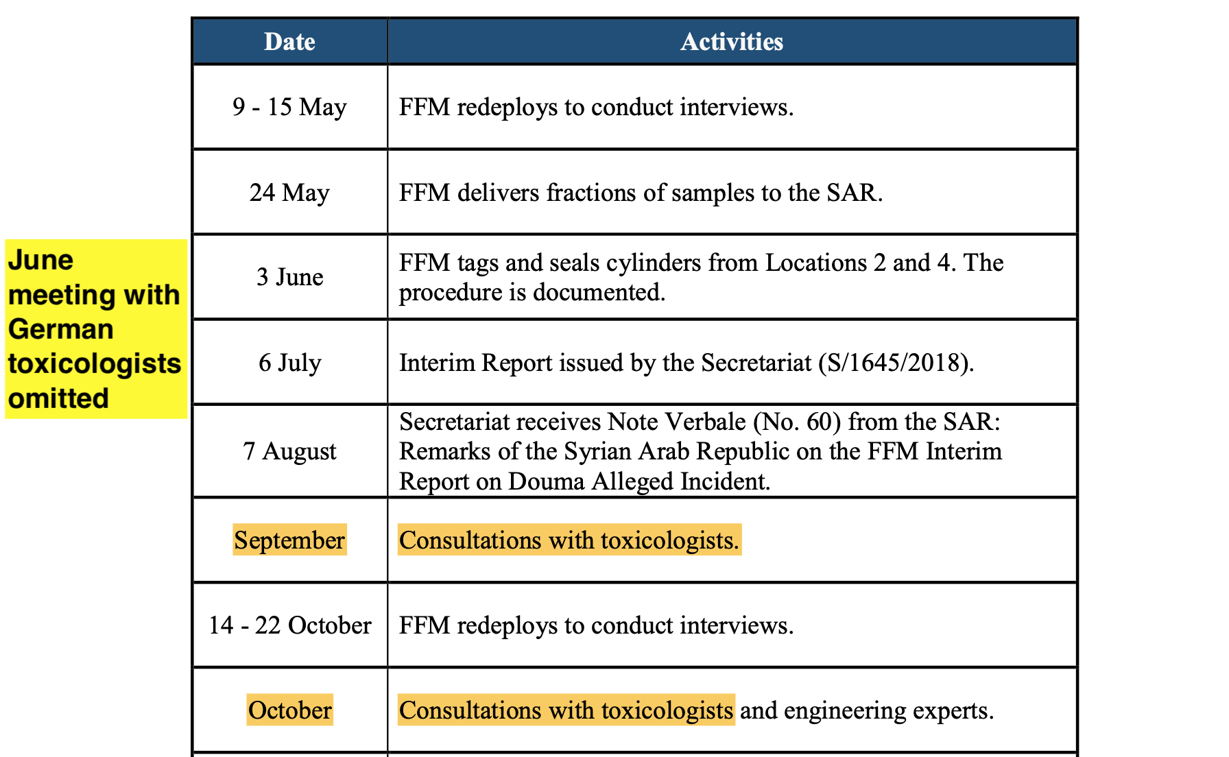 The OPCW leadership’s response to this conclusive assessment was to make it disappear. When the Douma team included the Germans’ input in their initial report, completed in late June 2018, senior officials went around them and erased all traces of it. The meeting itself was then memory-holed: in the OPCW Fact-Finding Mission’s (FFM) final report on Douma published in March 2019, a detailed timeline omits the team’s visit to Germany.